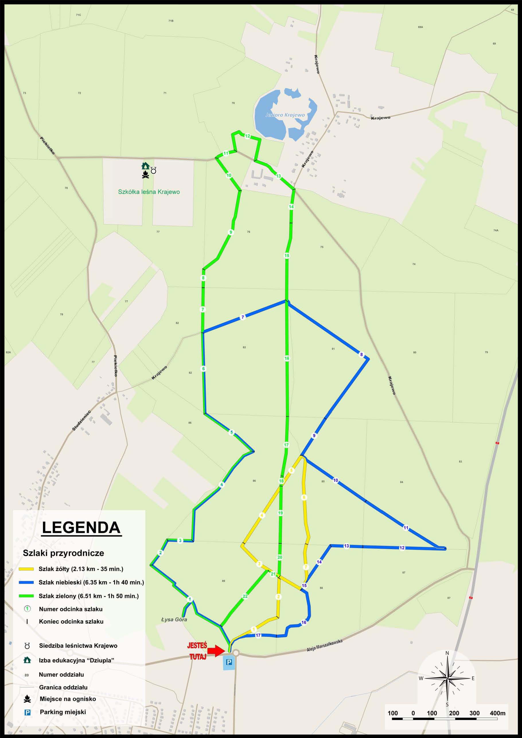szlak zielony: długość – 6.51 km, czas przejścia – 1h 50 min., stopień trudności – średni.